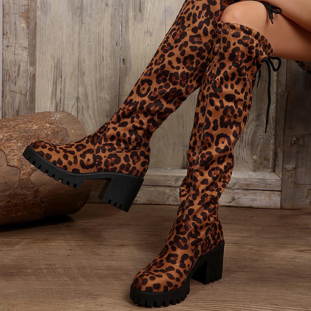Leopard Women Casual Comfortable Round Toe High Boots Knee High Fashion Chunky Winter Trend Designer Boots Shoes for Women
