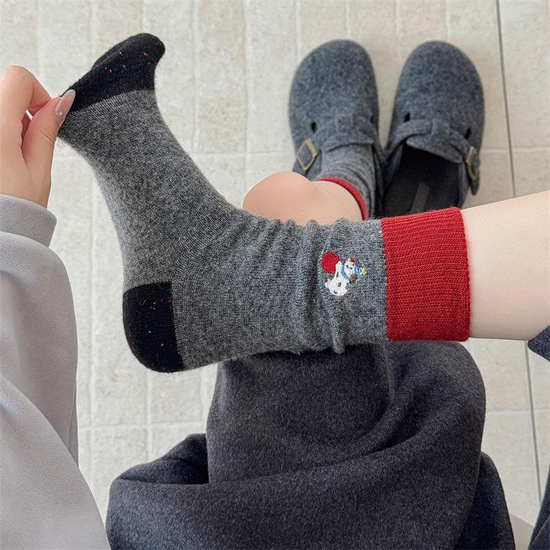 Color-blocking Embroidered Apple Dog Autumn and Winter Warm Wool Women's Pile Socks Simple Mid-calf Paired with Burken Shoes