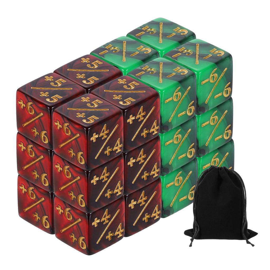 [Size & Packaging]: The package includes 24 dice counters in red & black and green & black (12 of each color) and 1 dice pouch. They are the standard D6 size of 16 x 16 x 16 mm (0.63 x 0.63 x 0.63"), providing ample quantities for everyday games and plenty of replacements.
