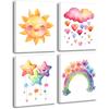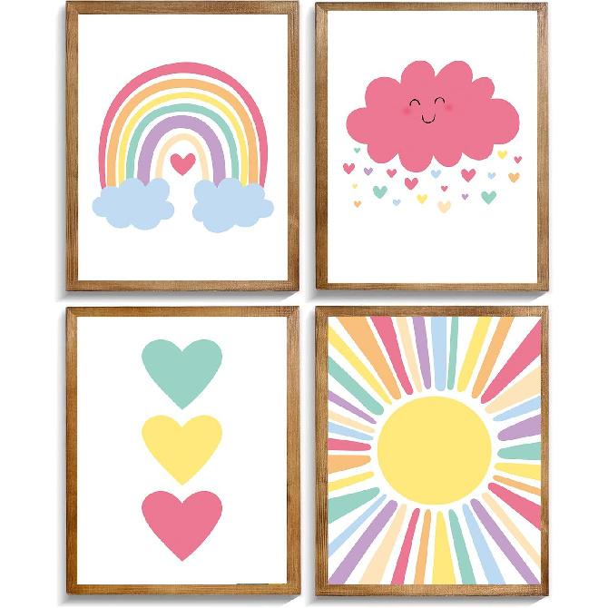 Pink Nursery Canvas Wall Art Rainbow Art Poster,Boho Rainbow Sun Hearts Canvas Wall Art,Kids Bedroom Baby Girls Toddler Pastel Wall Print for