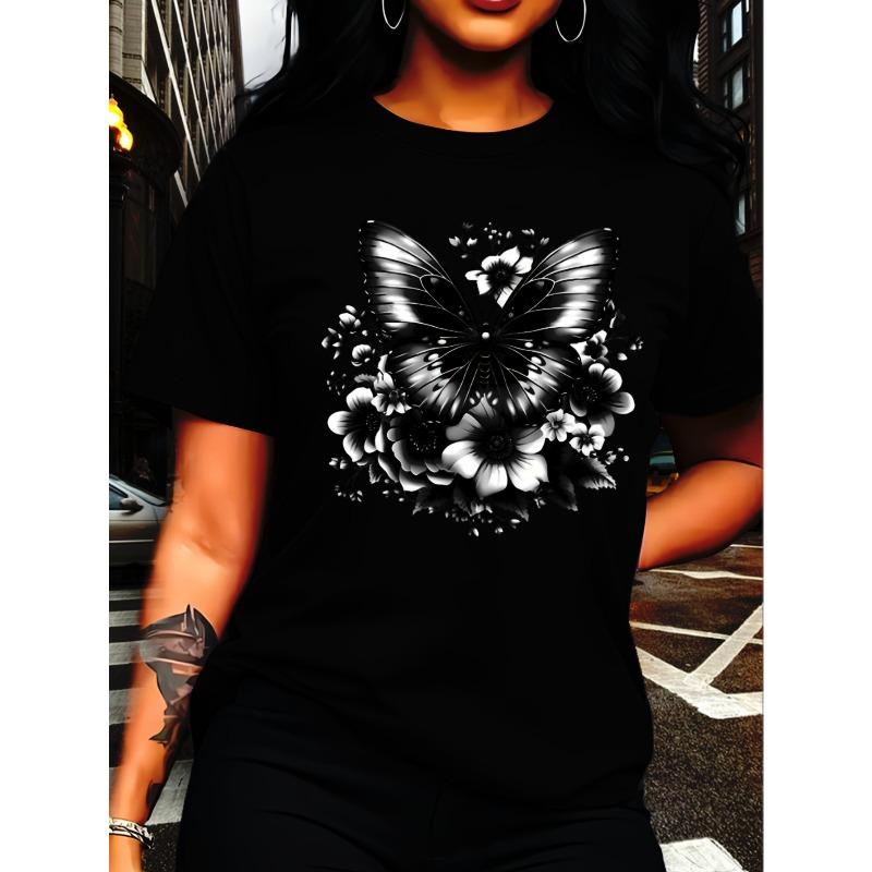 Womens Black Crew Neck Short Sleeve Tee Black White Butterfly Floral Print Slim Fit Trendy Unique Design Street Casual Daily Wear Top