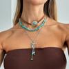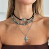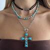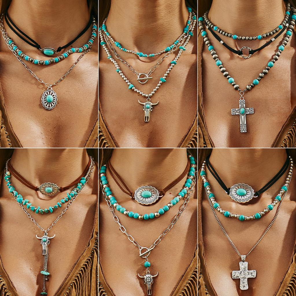 Ethnic Style Imitation Turquoise Beaded Cow Head Pendant Necklace, Retro Cross Flannel Collarbone Necklace