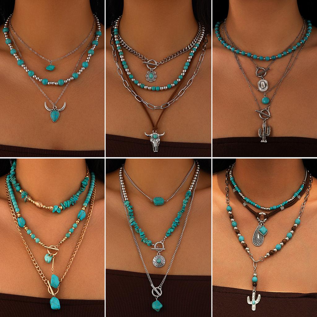 Retro Imitation Turquoise Cow Head Collarbone Necklace, Exotic Ethnic Style Cactus Stacked With Beaded Necklace