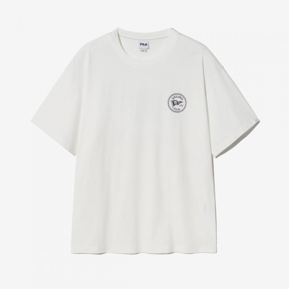 The FILA Sailing Flag Graphic Short Sleeve T-shirt is a men's sports short-sleeve T-shirt characterized by its vintage graphic design. This product features a sailing flag graphic as a highlight, adding a trendy touch to the item. The color is Beige, making it suitable for regular sports activities.