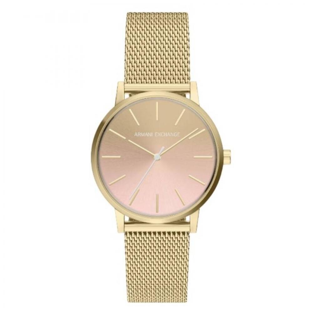 Gold-tone stainless steel case with a gold-tone stainless steel mesh bracelet. Fixed gold-tone stainless steel bezel. Pink dial with gold-tone hands and index hour markers. Dial Type: Analog. Quartz movement. Scratch resistant mineral crystal. Pull / push crown. Solid case back. Round case shape, case size: 36 mm, case thickness: 6 mm. Band width: 18 mm. Fold over clasp. Water resistant at 30 meters / 100 feet. Functions: hour, minute, second. Casual watch style. Armani Exchange Quartz Pink Dial Ladies Watch AX5619.