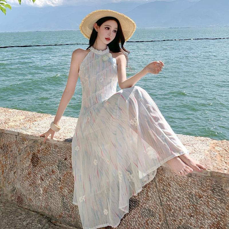 Seaside Vacation Dress Summer Waist Thin Sweet Design Lace Splicing Long Neck Dress