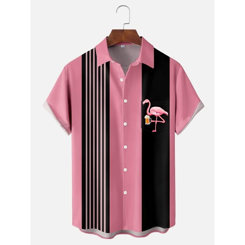 Men's Shirt, Hawaiian Striped Flamingo Print Short Sleeves
