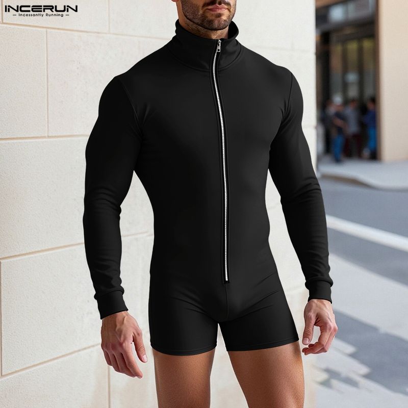 INCERUN Men High Neck Long Sleeve Zip-up Rib Jumpsuits Rompers Underwear