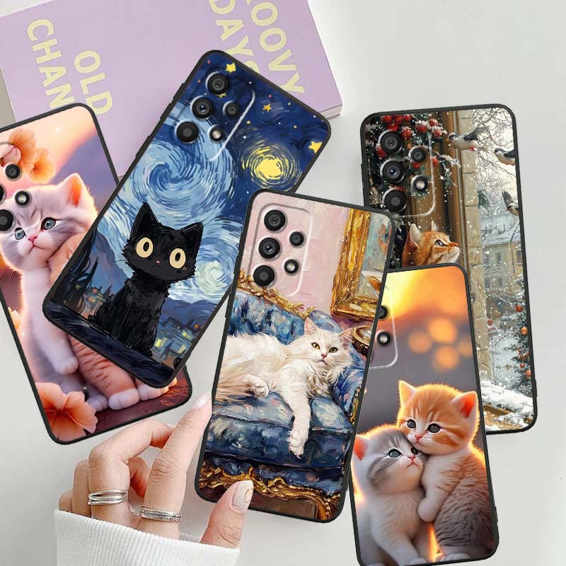 Cute Cartoon Cat Illustration For Samsung A41 A35 A34 A33 A32 A25 A24 A23 A21s A06 A05 A04 A03 Note 10 20 Ultra 5G Black Case