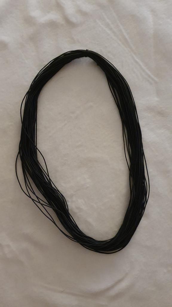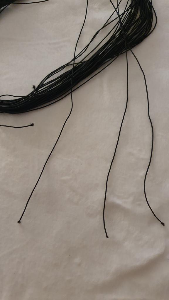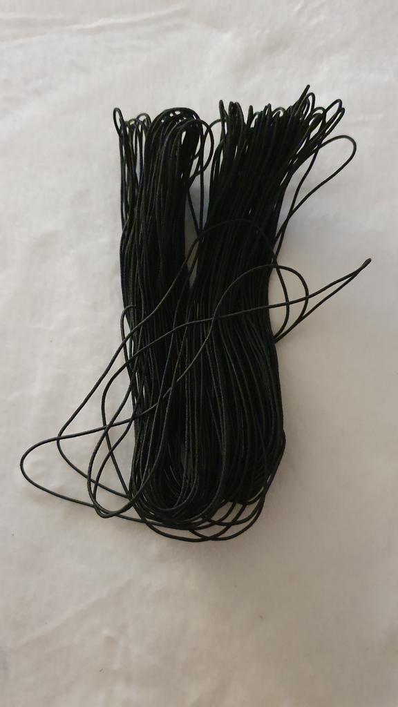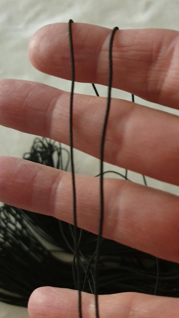 La taille de l’élastique est trop fin pour être utilisée pour les masques dommage car c’est l’utilisation que je lui destinée par contre pour faire des bracelets à perles La fibre qui enrobe l’élastique est synthétique très fragile à la chaleur car elle fond