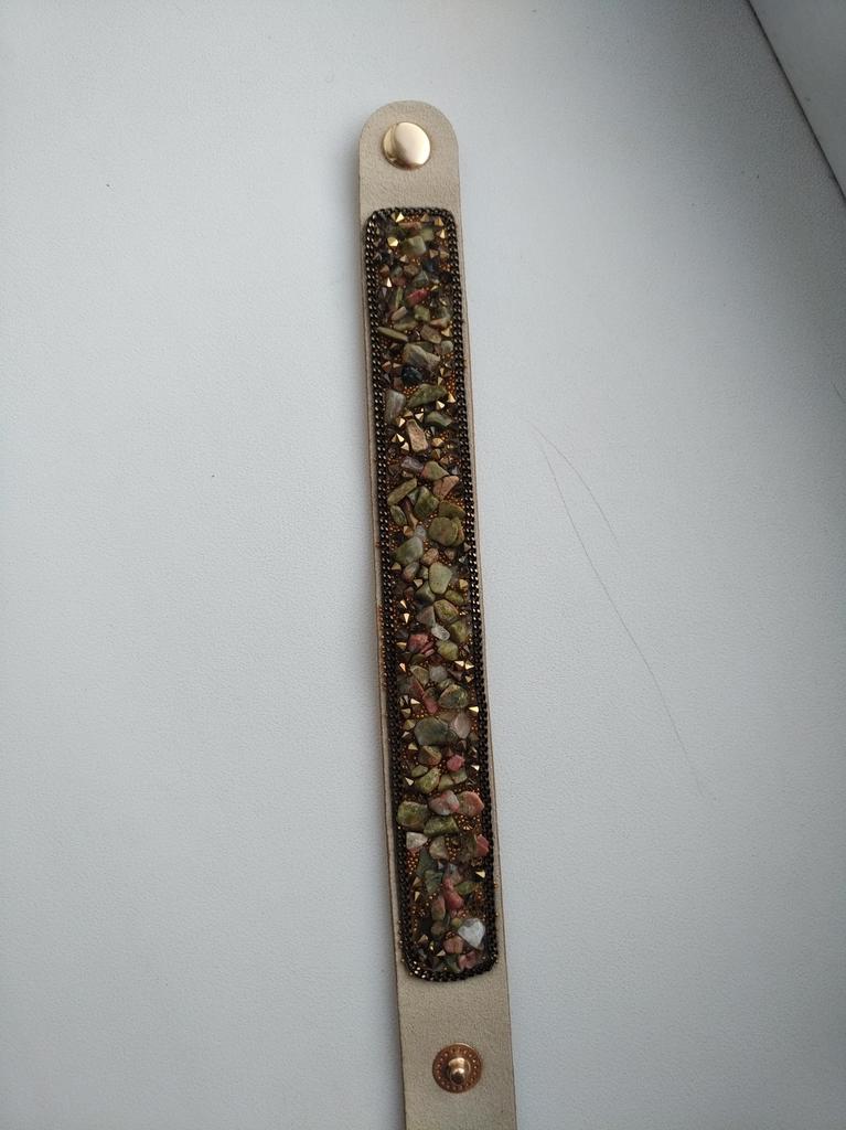 Très joli bracelet. Fabriqué avec amour et qualité. De véritables pierres précieuses (jaspe) ainsi que des cristaux de bonne qualité. Donne une apparence belle et élégante 🥰 Je suis un peu inquiet de la durée de vie du tissu de base. Malheureusement, ce n'est pas du cuir, il peut donc arriver qu'un jour le tissu se déchire.