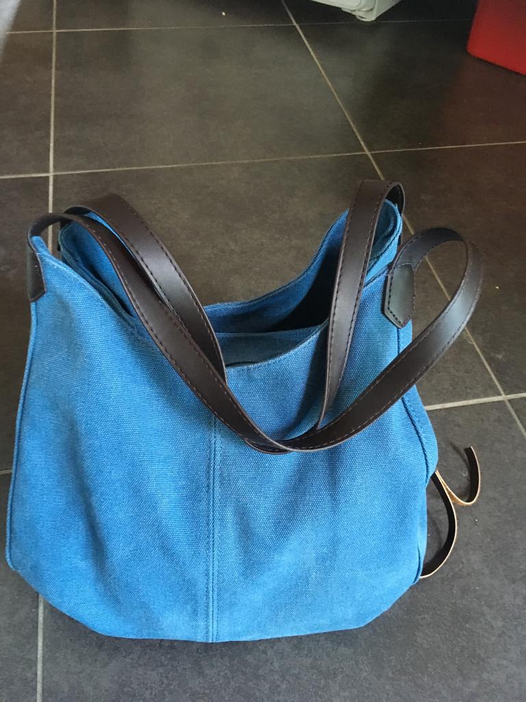 Tres joli sac en toile, je le pe sais en suédine, bonne taille , attention il n a pas de bandoulière, belle contenance merci.