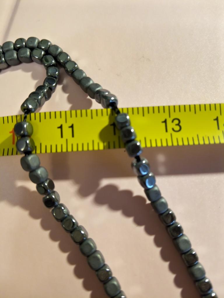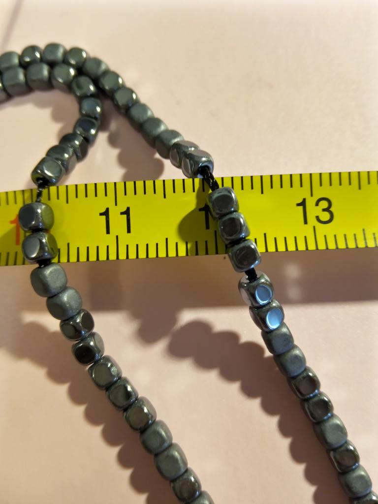 Vraie hématite. Comment vérifier : prendre un cordon et passer avec pression sur de la porcelaine non polie. C'est souvent le cas dans n'importe quelle cuisine, au fond du dos d'une tasse, assiette, etc... L'hématite véritable laisse une ligne rouge rouille (car c'est de l'oxyde de fer) La longueur du fil est de presque 42 cm.Je pensais qu'il serait un peu plus grand) Mais je suis content.