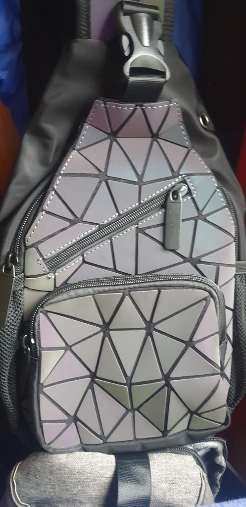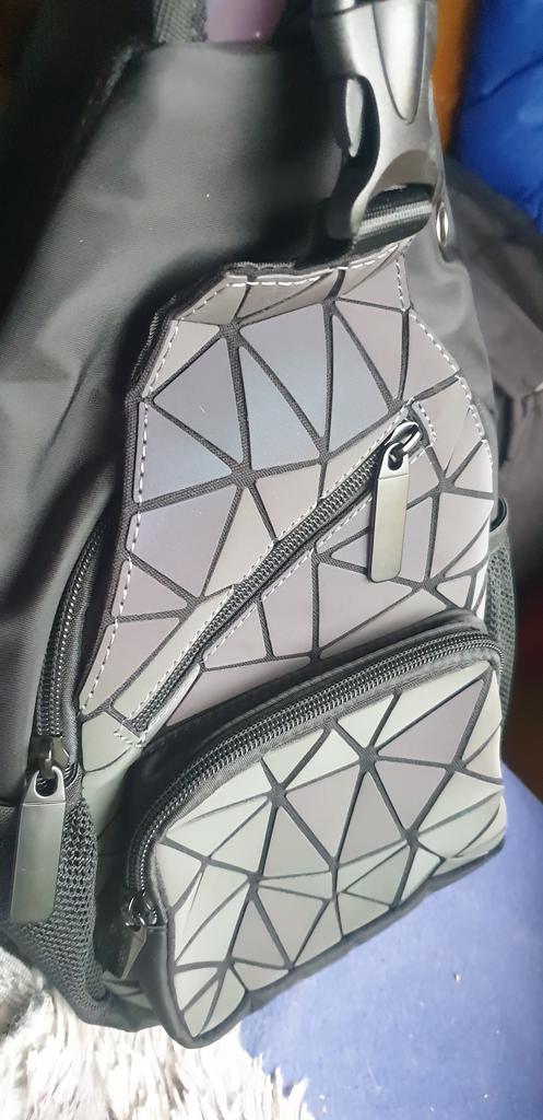 Ce petit sac à dos réfléchissant holographique est absolument incroyable! Matériaux solides de très haute qualité; les fermetures à glissière sont vraiment agréables et faciles à ouvrir et à fermer, et les triangles en plastique réfléchissants sont faits d'un tissu gris foncé épais qui fait briller les arcs-en-ciel sous une lumière vive. Il y a 5 poches intérieures et 2 poches extérieures en filet qui sont un peu trop petites pour une bouteille d'eau, mais qui pourraient contenir quelque chose de plus petit. La sangle est convertible et peut être zippée en une ou deux (comme un sac à dos). Les clips sont fabriqués à partir d'un plastique robuste et sont faciles à ouvrir et à fermer.. La grande poche à l'intérieur peut à peine contenir un cahier A5 ou tout autre objet plus petit. Le petit trou avec un œillet en métal s'adaptera à un cordon avec une prise casque, mais pas à un câble de chargement USB. C'était aussi très bien emballé en 3 couches sans défauts et l'expédition a été rapide, environ 2 semaines. Je recommande vivement ce sac.