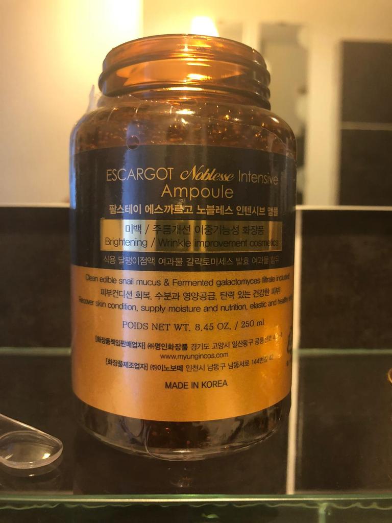 Grand pot de 250 ml, le sérum a la même consistance qu'un gel pour les cheveux. 💖⭐ Un bâtonnet est fourni afin d'éviter de mettre les doigts dans le produit. ⭐💘 Il faut ensuite appliquer une crème, comme un sérum classique. (texte en coréen uniquement) 😝 Sensation de fraîcheur sur la peau. 🌹👍 Arrivé en 22 jours.