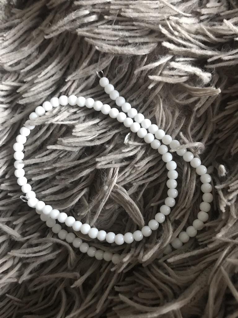 Les perles sont synthétiques ou en céramique, car elles sont parfaitement blanches sans inclusions, comme d'habitude dans les pierres naturelles. Le nombre n'a pas compté, la longueur de la rangée est de 38 cm.
