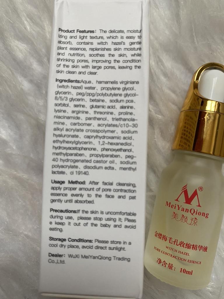 Bonne texture pour rétrécir les pores. Bouteille en verre givré. La couverture est dorée. On dirait un voyage. Et c'est agréable à tenir en main. Le flacon est plein, jusqu'au bout. L'essai lui-même est un peu gelé. Facile à appliquer, rapidement absorbé. La moisissure n'apparaît pas sur la peau. La peau est lisse, hydratée. Je ne peux rien dire à propos du rétrécissement des pores. Je ne l'ai utilisé que deux fois. Le vendeur a tout envoyé rapidement. Numéro de piste partiellement suivi. Livraison en France à 3 semaines