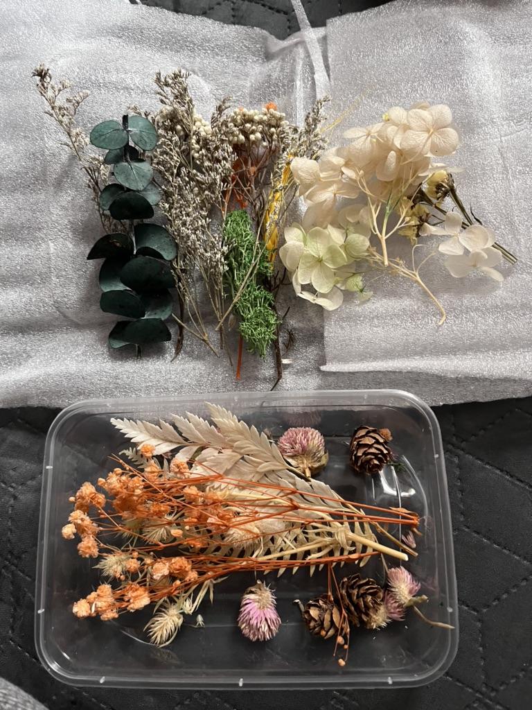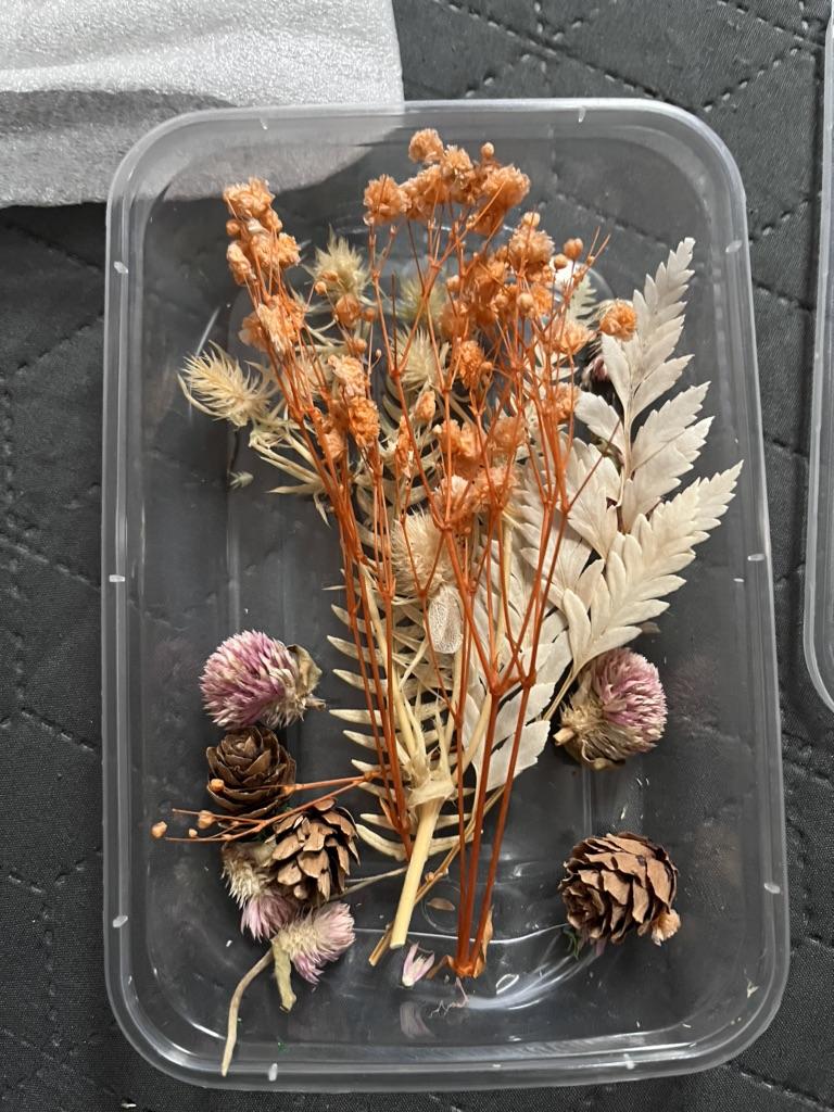 j'ai acheté ces fleurs séchées car je voulais les utiliser pour certains projets d'époxy mais j'avais un peu peur qu'elles se soient cassées quand je les ai eues en raison du long transport. Mais j'ai été agréablement surpris par la qualité de leur emballage. J'étais vraiment content de la sélection dans la boîte et j'ai tellement hâte de commencer à les utiliser. Un grand choix de couleurs et de fleurs différentes est vraiment heureux.