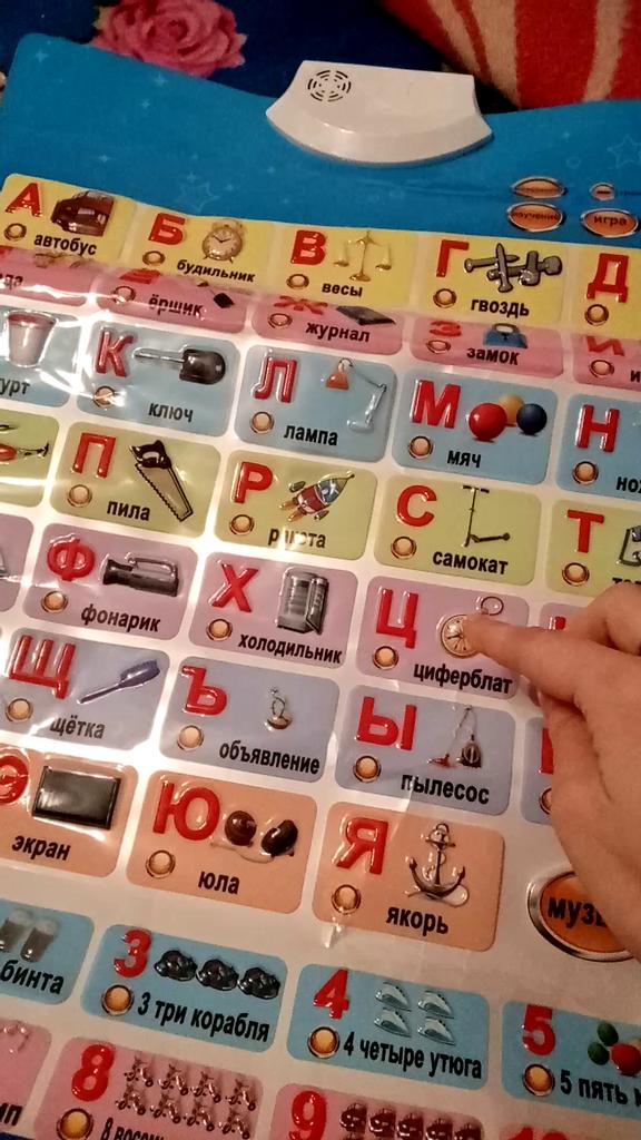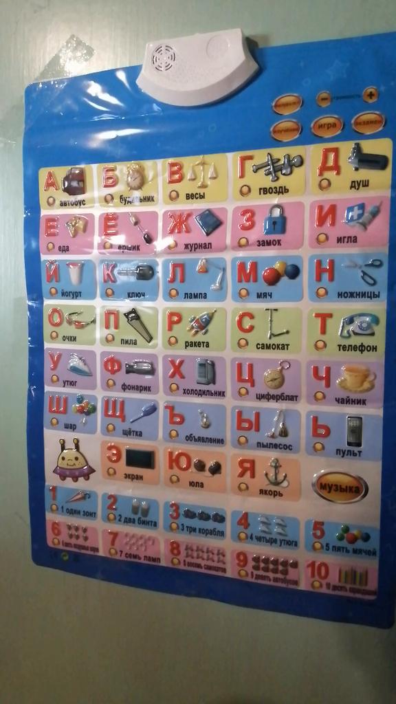 Bon alphabet, avec accompagnement sonore. L'enfant l'aime, étudie indépendamment l'alphabet, je le recommande à l'achat. Merci.