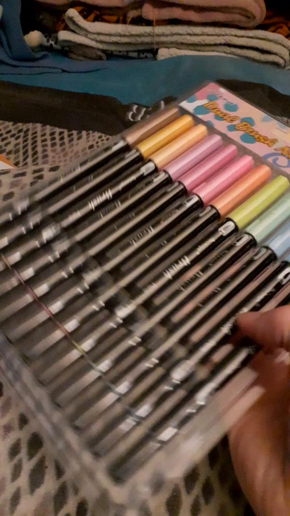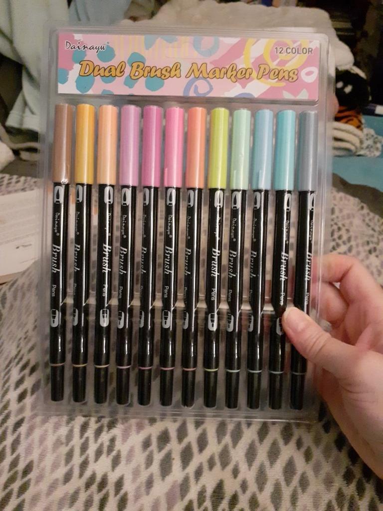 Enfin, j'ai déballé mes nouveaux feutres ! 😍 Ils sont super 😊❤️ J'ai été surpris par leur taille - ils sont vraiment très gros ! Sur la dernière photo, vous pouvez le mieux voir - je pose pour la photo pour l'échelle. Il y a 12 couleurs dans l'ensemble et en fait chaque couleur est complètement différente. Remarque - l'intensité de la couleur est également différente. Certaines sont vraiment lumineuses et pastel, d'autres sont plus intenses. Généralement toutes les couleurs sont plutôt délicates comme le montrent les photos du produit. Évaluez par vous-même - je joins un exemple de tableau. Comme vous pouvez le voir, j'ai essayé des feutres sur deux papiers - un papier marqueur avec une texture très lisse et un papier aquarelle qui est très rugueux. Les couleurs sont magnifiques sur les deux papiers, bien que les papiers aquarelle montrent mieux que certains feutres sont plus humides que d'autres. 🤔 La pointe étroite est cool, plus rigide qu'un marqueur ordinaire du marché. Je peux dire que je suis très positivement surpris. Bientôt, j'utiliserai des feutres pour un projet artistique - je partagerai certainement mes photos avec vous ❤️