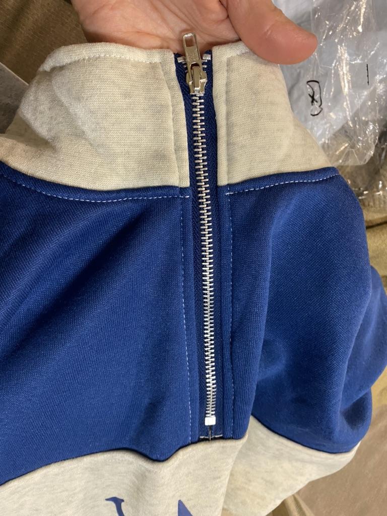 La qualité de couture est terrible ! Les coutures sont tordues, cousues avec des fils blancs sur un tissu bleu