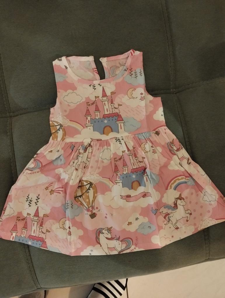 La robe est ok. Très mignon, couleur vive. Le tissu en coton propre, un peu rugueux comme du linge de lit, respirera bien en été, mais il ne s'étire pas du tout, il est donc plus difficile de s'habiller, uniquement avec les mains droites levées. Il est bon de prendre une taille deux plus grande, de sorte qu'il n'y ait pas de problèmes avec la robe. Nous avons pris 110 à 3,5 ans, 12 kg, 90 cm (d'habitude maintenant je porte du 98), et la taille est très correcte, ça va librement, mais ça ne nage pas non plus. Prix/qualité correspond. On voit comment la couleur et la taille se comportent en été après quelques lavages.