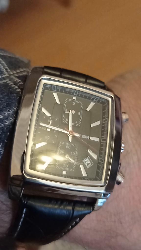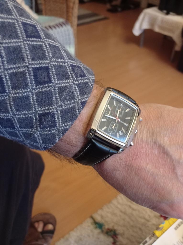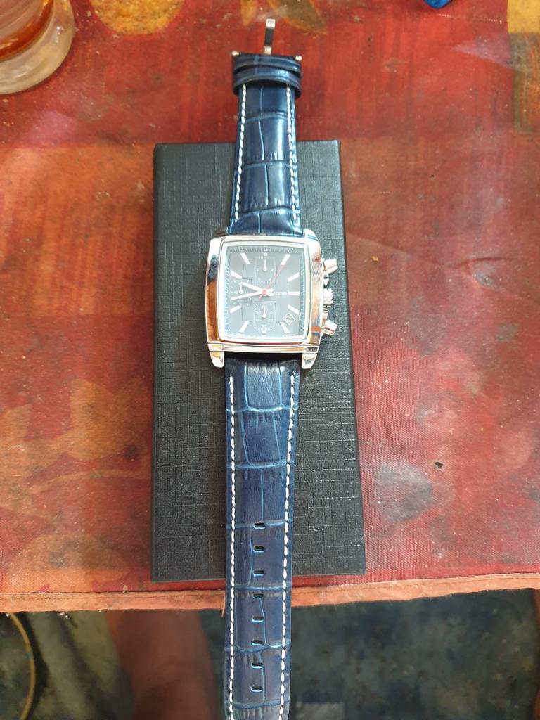 Arriver dans sa boite entouré de papier bulle. Juste dommage que la montre sois déjà en marche mais sinon elle est tres belle et a l'air de bonne facture!