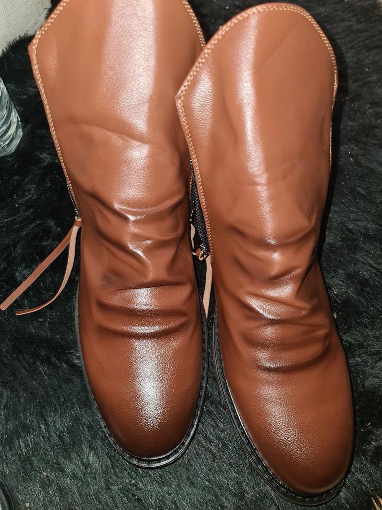 Bien évidemment, pour ce prix dérisoire, il ne faut pas s'attendre à du cuir, mais plutôt à du simili cuir ou matériau plastique. Les semelles noires sont très brillantes. À voir pour la qualité des zips et des semelles sur le moyen terme. Produit emballé soigneusement dans du papier bulles et déposé délicatement dans ma boîte aux lettres. Suivi du colis impeccable. Produit correct dans l'ensemble.