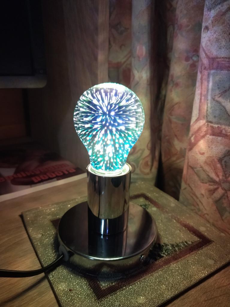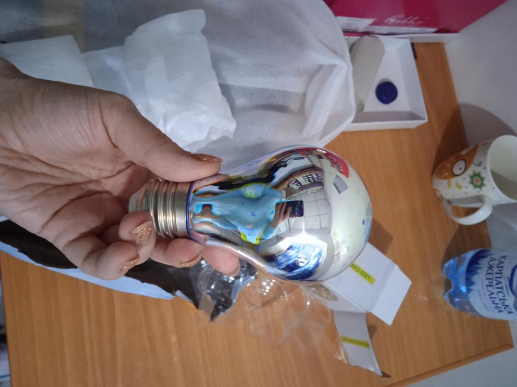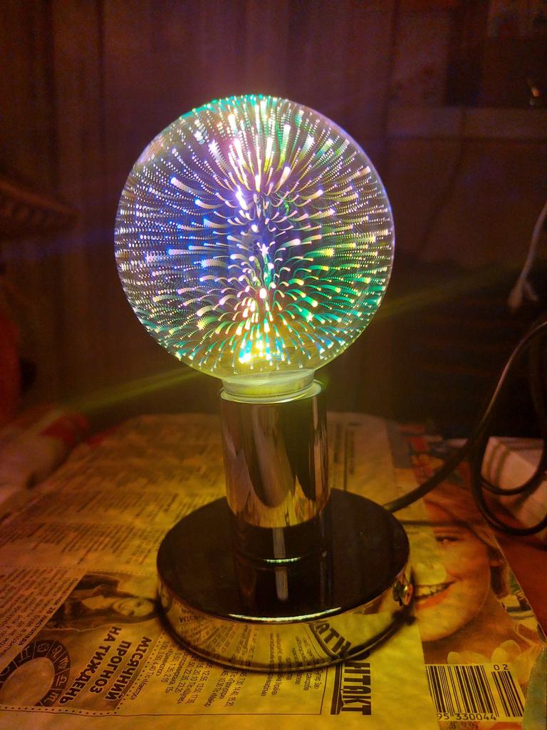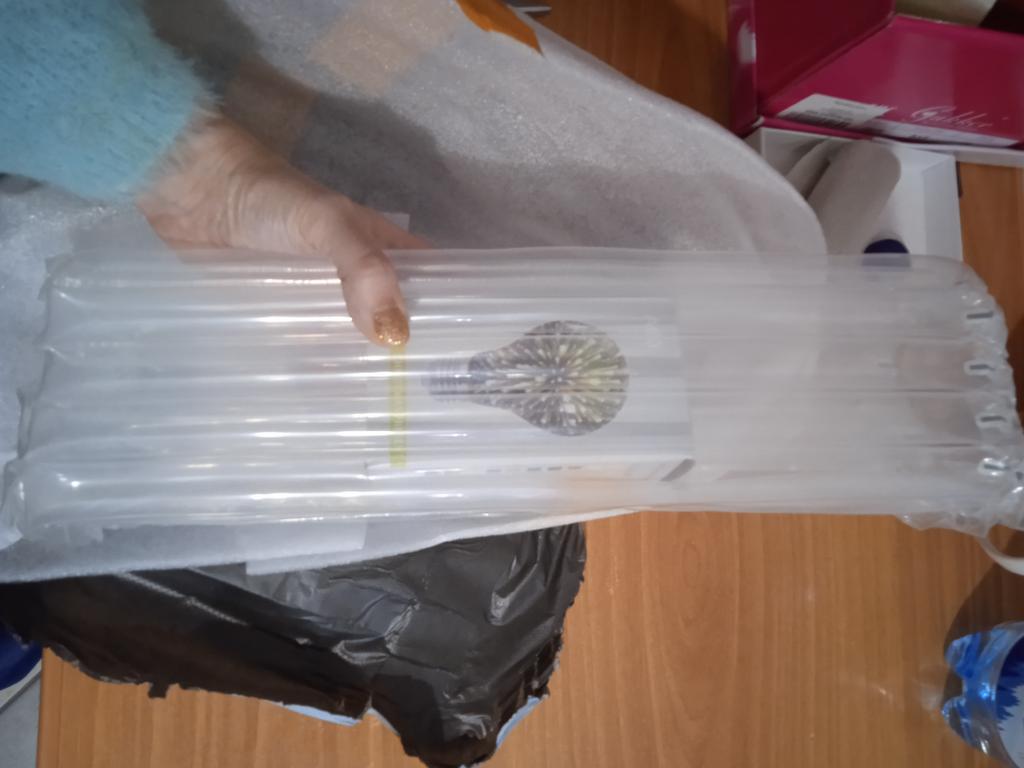 Les marchandises étaient en route depuis environ un mois. Emballé très soigneusement, dans une boîte, puis dans une serviette en mousse plastique souple et ensuite dans un emballage aérien, comme ceux qui emballent les chaussures. La lampe est petite, la lumière est jaune avec du violet à l'intérieur. La lampe non commutée a une surface opaque en acier-miroir. À l'intérieur, la lampe est très jolie, crée une atmosphère festive et chaleureuse. Je recommande le produit et le vendeur. La photo ne rend pas bien les couleurs