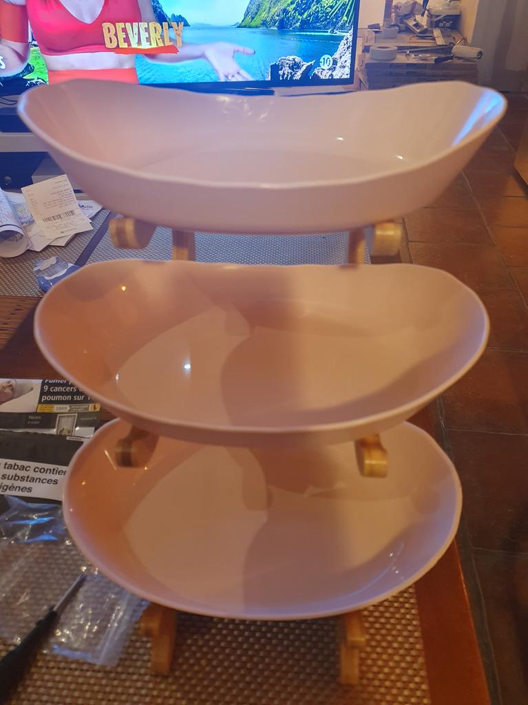 Arrivé dans les temps. Ravie de mon achat 😊 Les plats sont en plastique dur.