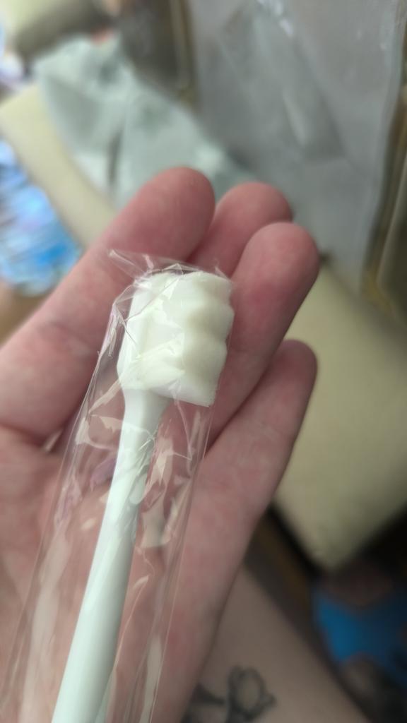 Brosse très douce, comme une brosse pour bébé. Il n'élimine pas la plaque dentaire aussi bien qu'une brosse à dents qui frotte, mais il n'endommage pas les gencives.