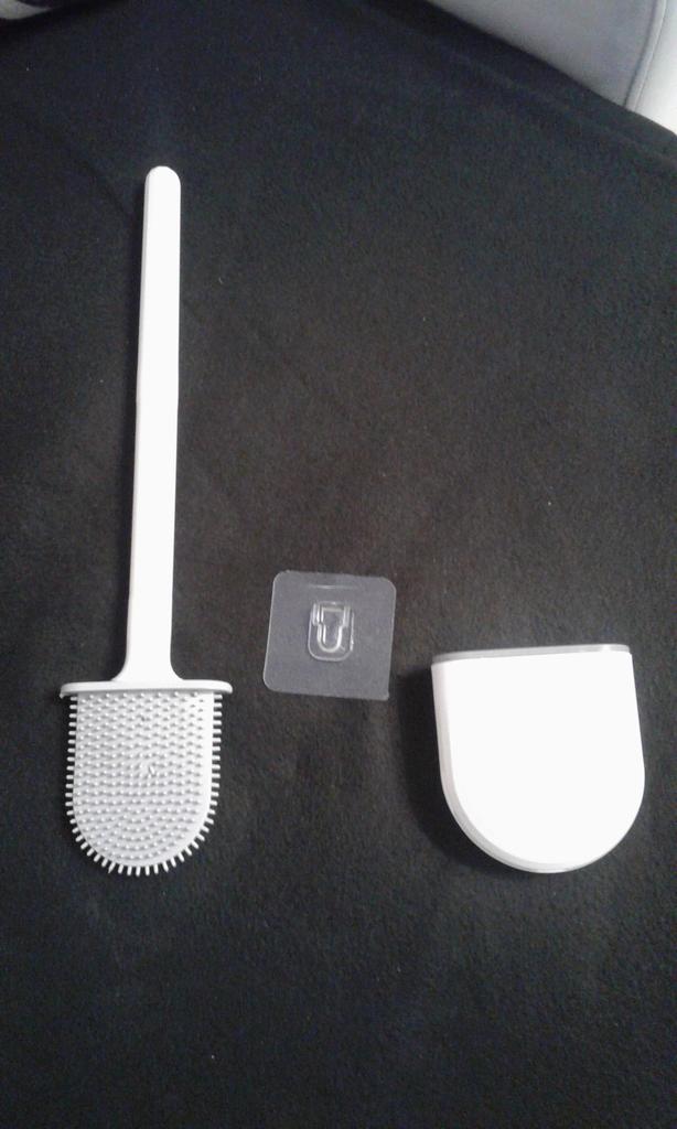 Conforme à la description. La brosse est bien souple, c'est idéal pour aller sous le rebord des toilettes. L'adhésif est là pour pouvoir fixer le tout sur le mur. Livraison en 20 jours.