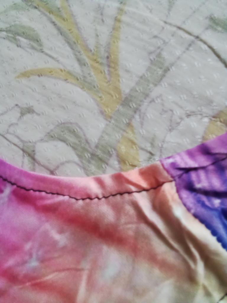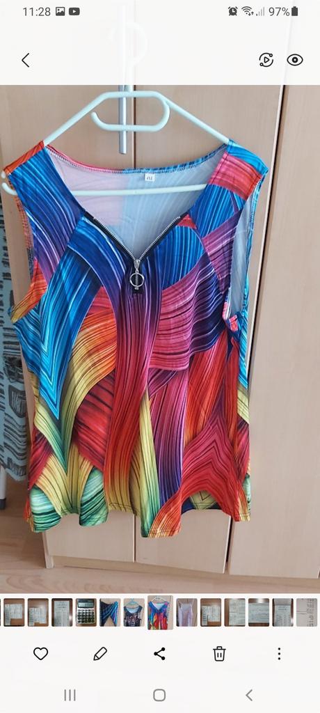 Le chemisier ne correspond pas du tout en couleur, sur la photo il est comme volumineux, ce qui ajoute du piquant au chemisier. Sur le chemisier, les lignes sont plates et pas aussi fortement enroulées.. Sur la photo, les couleurs des rayures sont un beau bleu vif et un lilas, en réalité bleu délavé et lilas brunâtre. Les piqûres ne sont pas droites, car tout est surpiqué avec du fil noir, ce qui est frappant sur les parties claires.. Au final, j'ai reçu un débardeur pas très intéressant et de très mauvaise qualité
