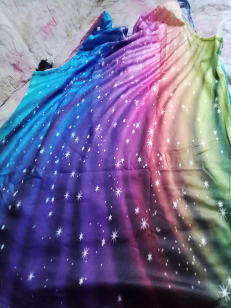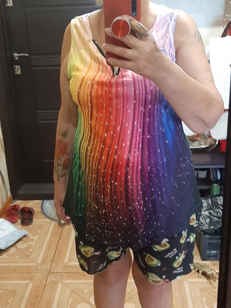 Le tissu est agréable, viscose veloutée, mais il est étiré sur le ventre, tous les plis du ventre sont visibles, la longueur n'atteint que les hanches. Je n'ai pas aimé ça.