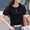 Été Patchwork dentelle fleur manches bouffantes coton T-Shirt boutons col rond femmes élégantes dames mince hauts à la mode