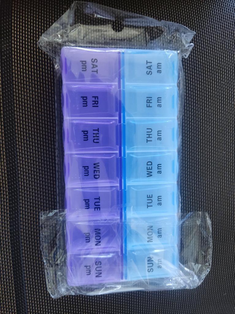 Léger et compact. Les compartiments pour les médicaments sont profonds. Les couvercles se ferment hermétiquement, mais pas tous (Conçu pour une semaine entière, jour (bleu) et soir (violet). La semaine commence à partir du dimanche.