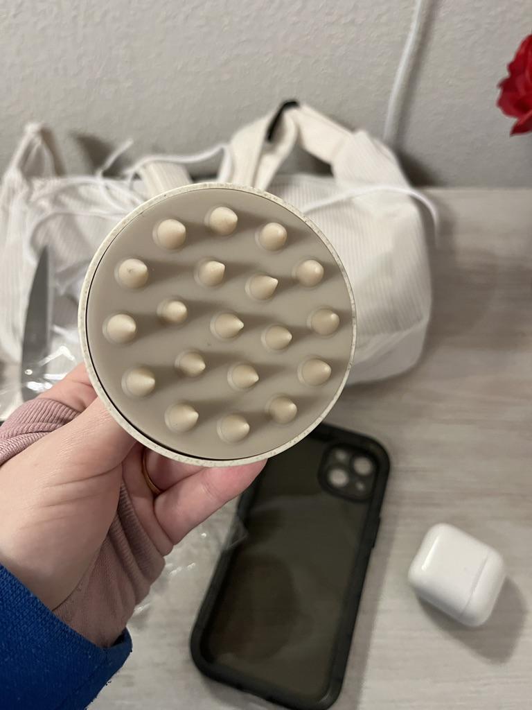 Joli masseur, c'est agréable de masser le cuir chevelu, ça ne gratte pas. La qualité est bonne, il y a une petite odeur si on la tient près du nez, mais je pense qu'elle disparaîtra plus tard.