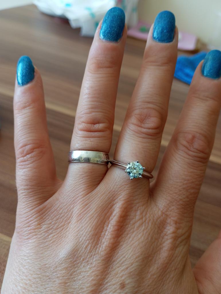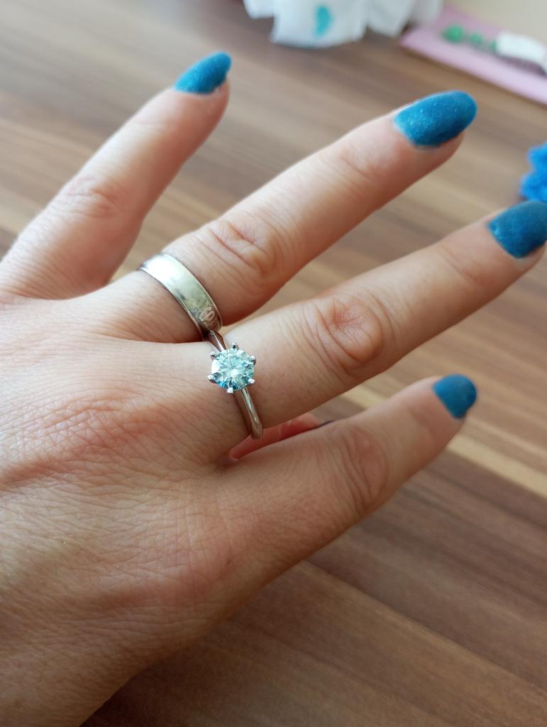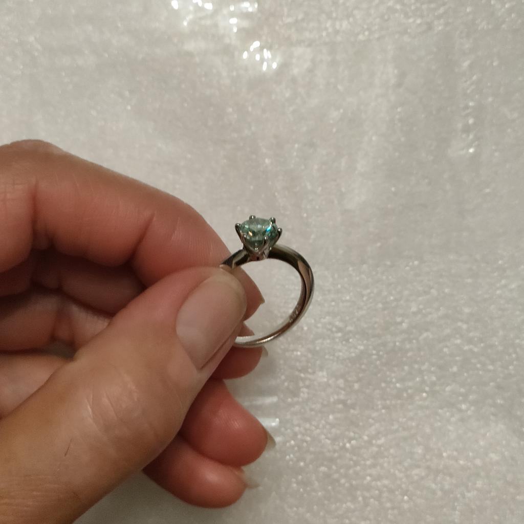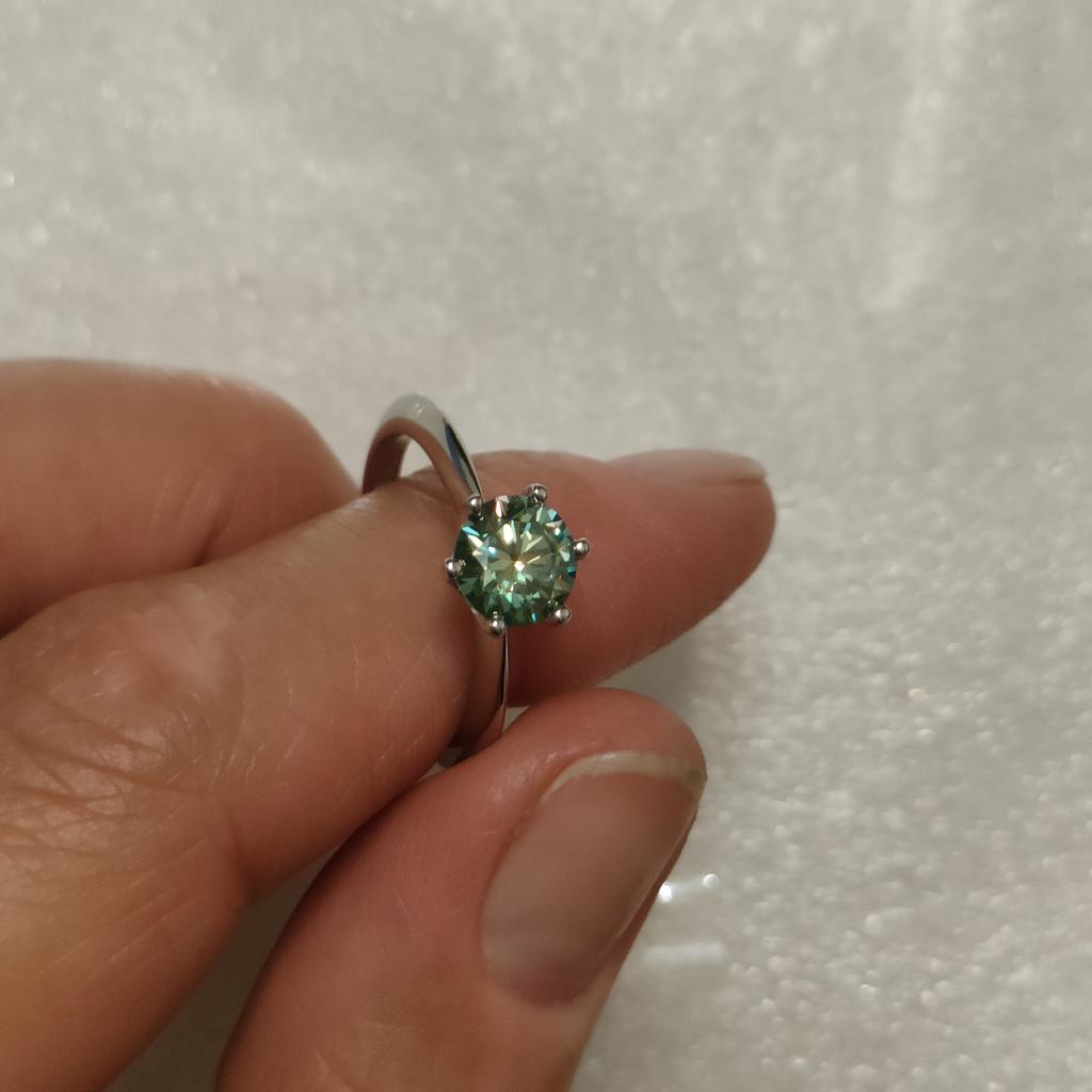 Le vert moissanite est si beau, scintillant à la lumière. La taille correspond à la taille déclarée. Une très belle bague.