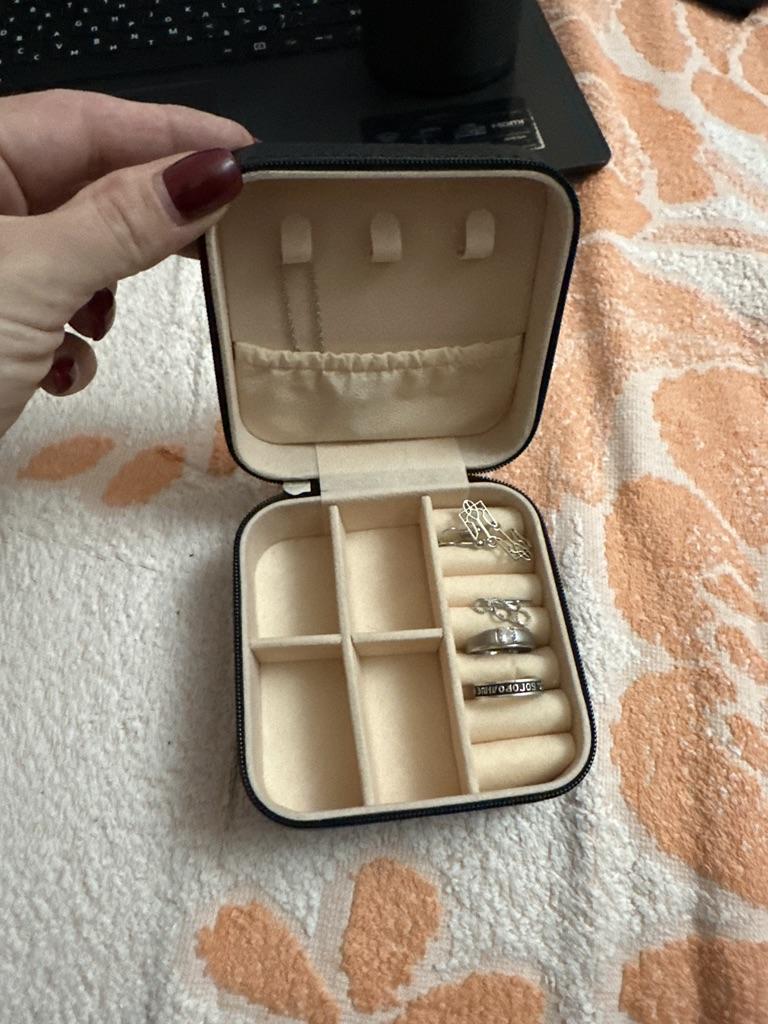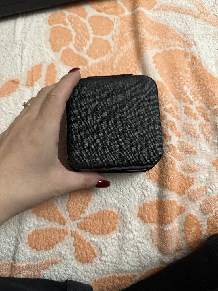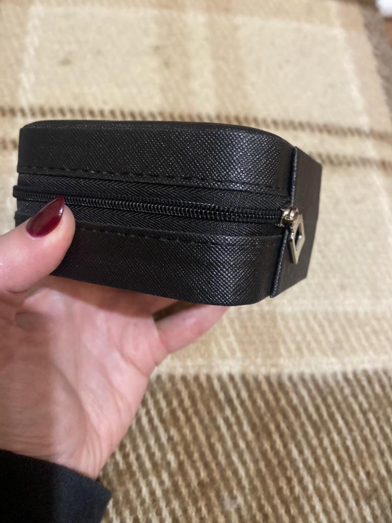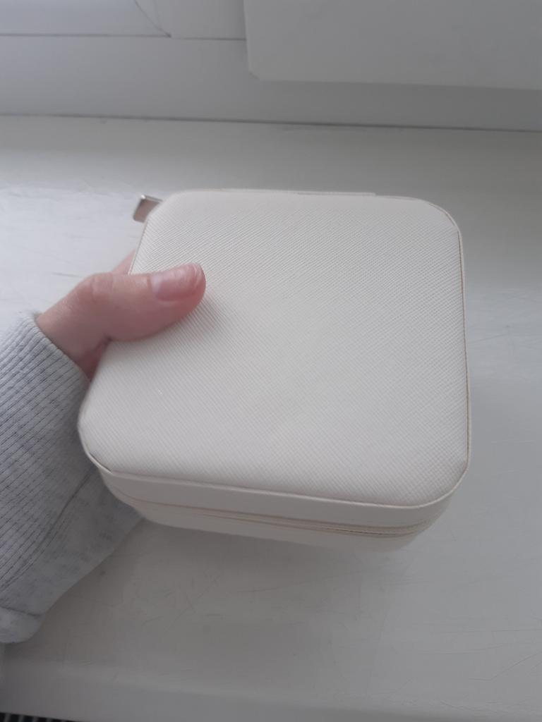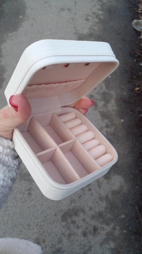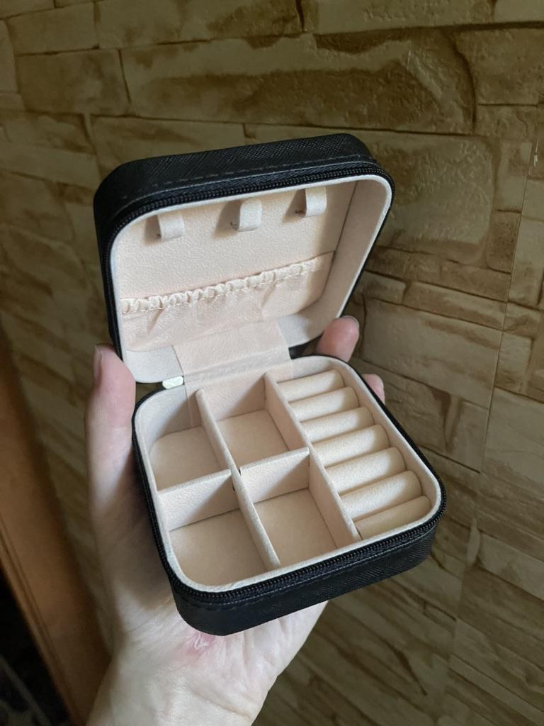 Une belle boîte à bijoux. La couleur est comme sur la photo. Il y a des endroits où le cercueil est collant, comme s'il était en colle. Ça sent la colle, j'espère qu'elle se dissipera avec le temps. Le matériau à l’intérieur n’est pas doux, mais ressemble à du papier.