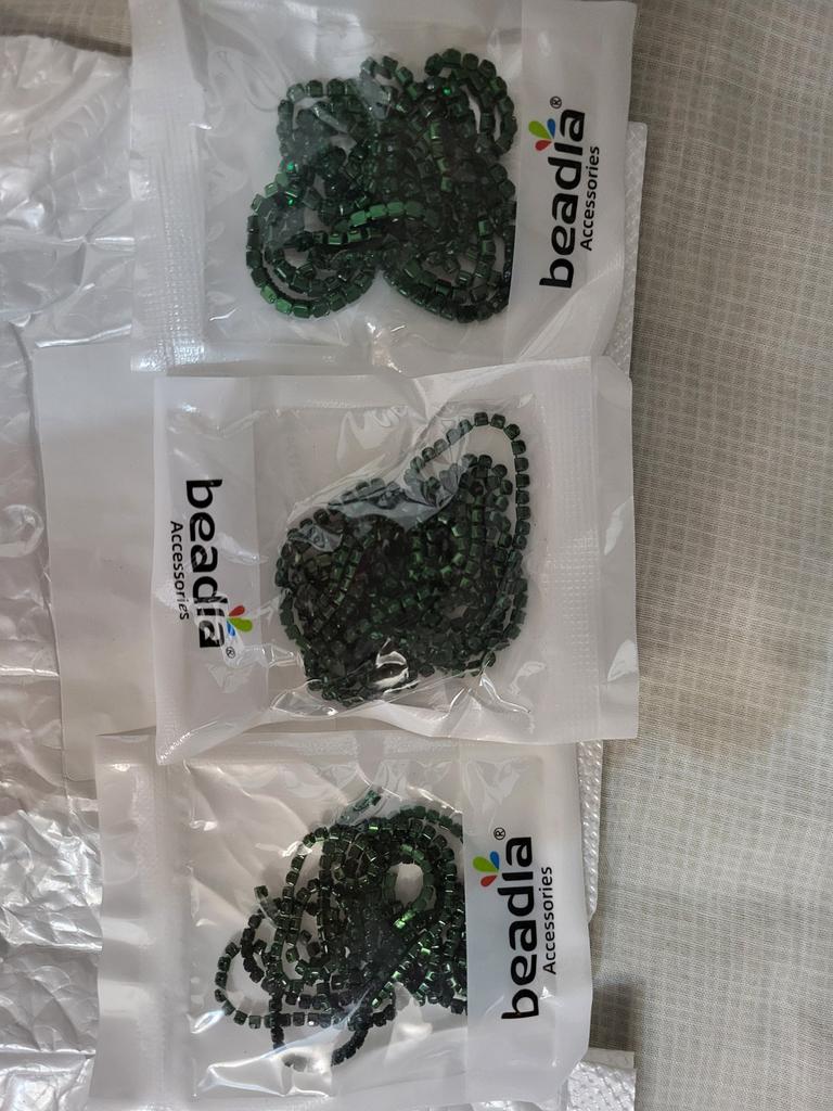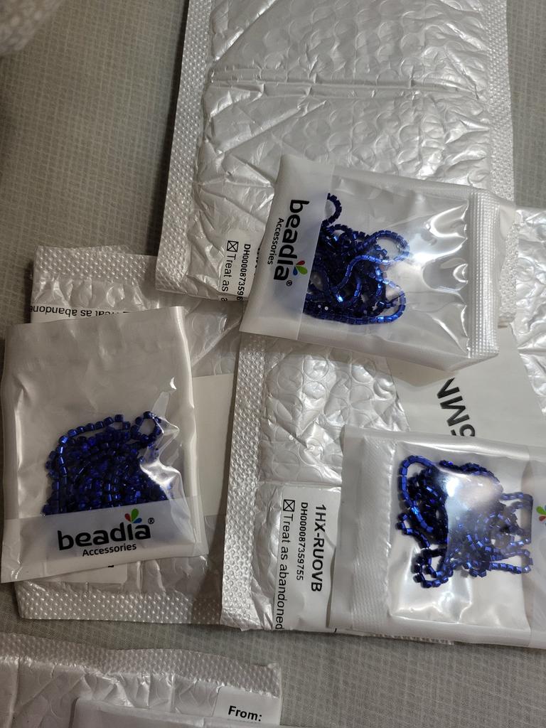Les petits cailloux sont également endommagés, il en manque un, mais il était dans le colis, il a juste été coupé négligemment et il est tombé, mais ici au tout début il peut être réparé, contrairement au bleu, qui doit être coupé par 2 cm, bien que la chaîne elle-même mesure 91,5 cm (soit 1 yard)
