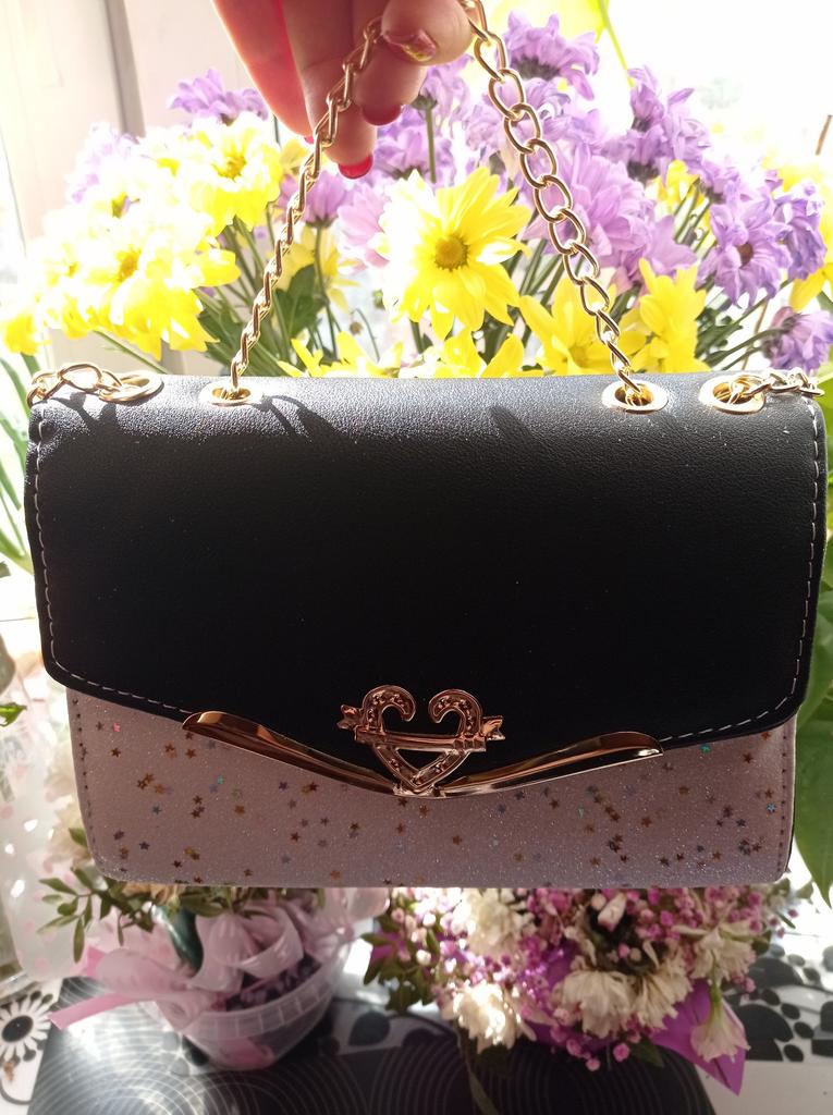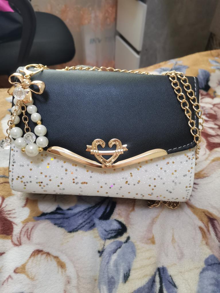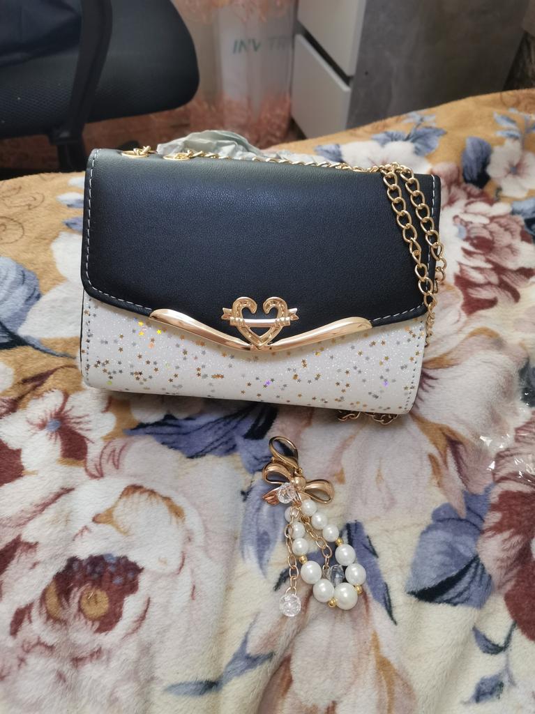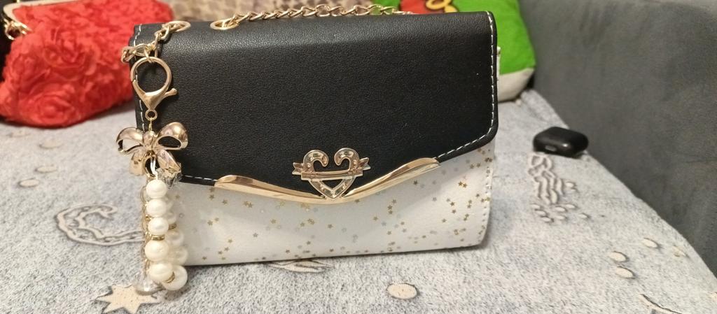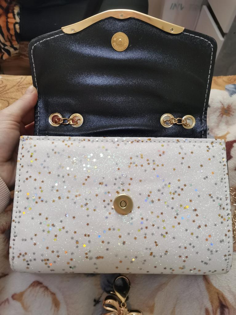 Le sac à main est mignon, il est arrivé non froissé, sans plis, ce qui a plu. Il y a aussi une multitude d'étoiles brillantes, je ne pensais pas qu'il y en aurait autant, et il y a une odeur désagréable à l'intérieur, j'espère qu'elle s'estompera.