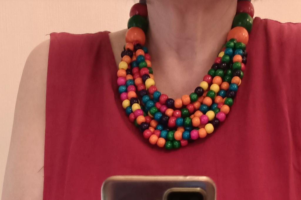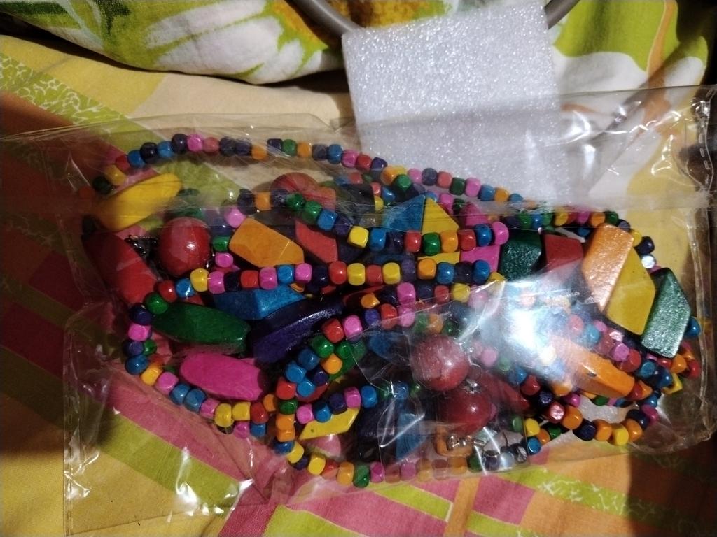 Perles en bois. Je n'ai pas eu le temps de les porter en été. J'aime.