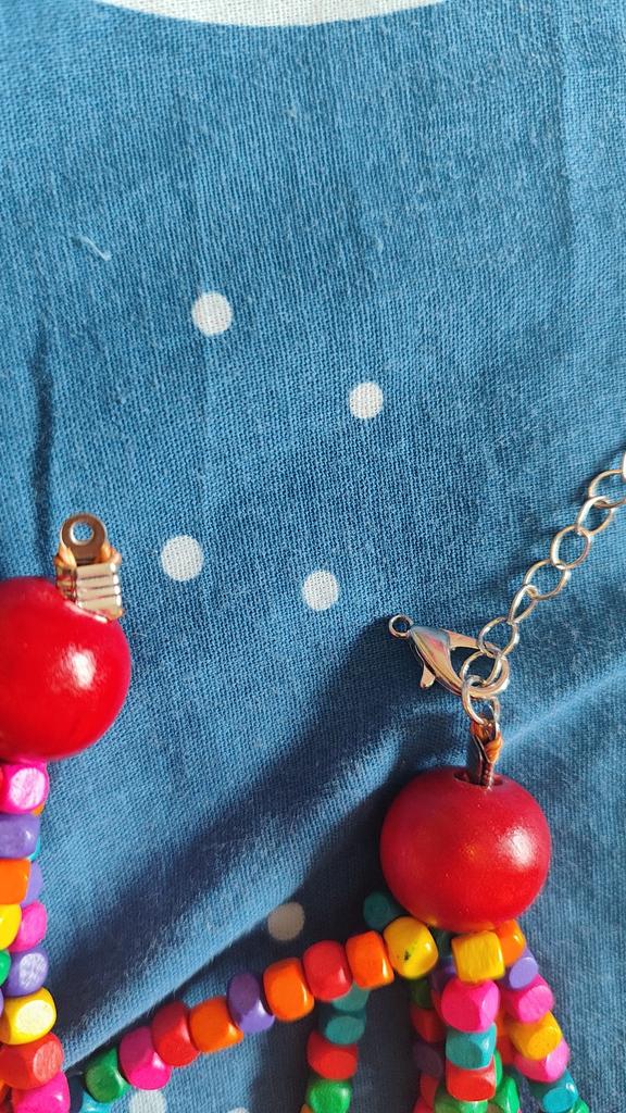 Perles en bois colorées. Pas lourdes, n'appuient pas. Elles sont confortables