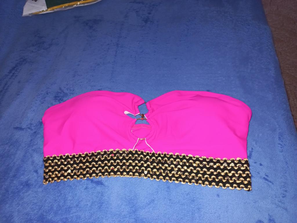 Le corsage est ample, l'élastique est plutôt faible, il n'y a pas de push-up. Et la couleur et la rayure dorée sont comme sur la photo.
