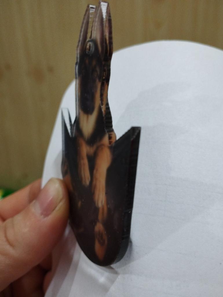 Tout va bien. Le chien est cool mais ce n'est pas une peluche. Il est découpé sur du plastique et sur lequel est appliqué un graphisme.