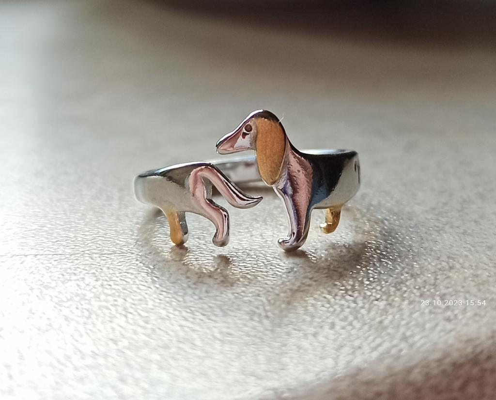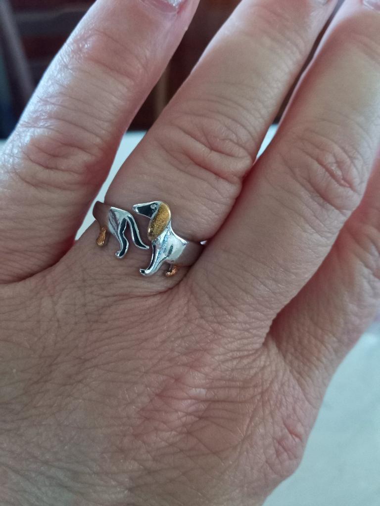 La bague est juste adorable, d'autant plus que j'aime la race de chien teckel, j'adore cette race et j'ai et des bagues et des broches et une collection de peluches en forme de teckels. J'ai une collection, même si elle est petite, mais elle existe. J'ai aussi un chien teckel à la maison, déjà le troisième. Les deux premiers, mère et fille, vivaient avant elle et malheureusement ils ne sont plus là, ils sont morts de vieillesse et de maladies, et celle-ci n'a que trois ans, et je l'adore. J'aime tout ce qui est lié aux teckels, aux chatons... et en général j'aime toutes sortes d'animaux... et même les reptiles... mais pas tous
