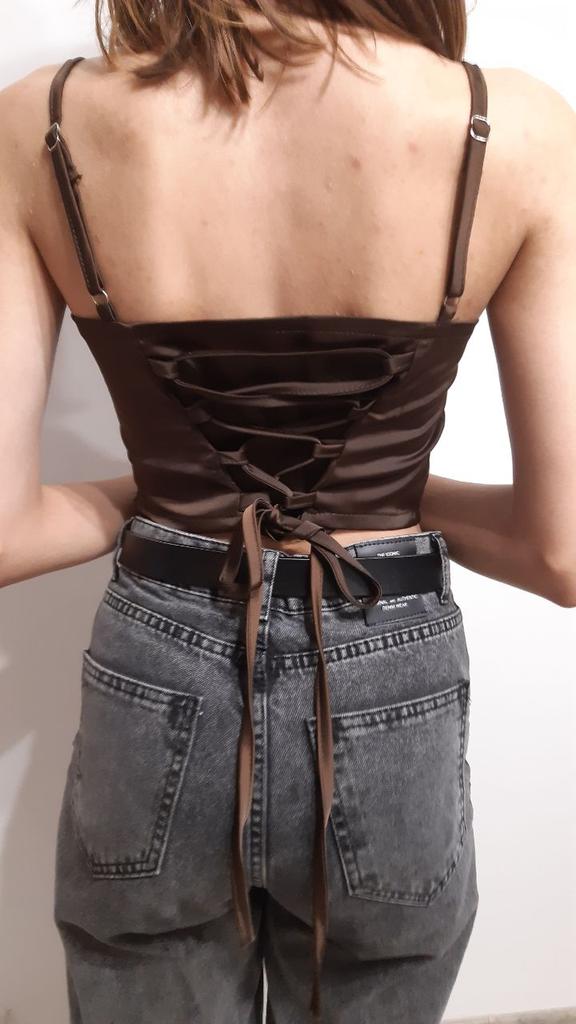 Au dos, le t-shirt est réglable avec un laçage, il n'est donc pas si difficile de deviner la taille, la qualité est plutôt bonne, le produit a duré environ un mois. Ce n'est pas un corset, il n'y a pas d'os là-bas, juste un t-shirt avec une coupe pour un corset)))