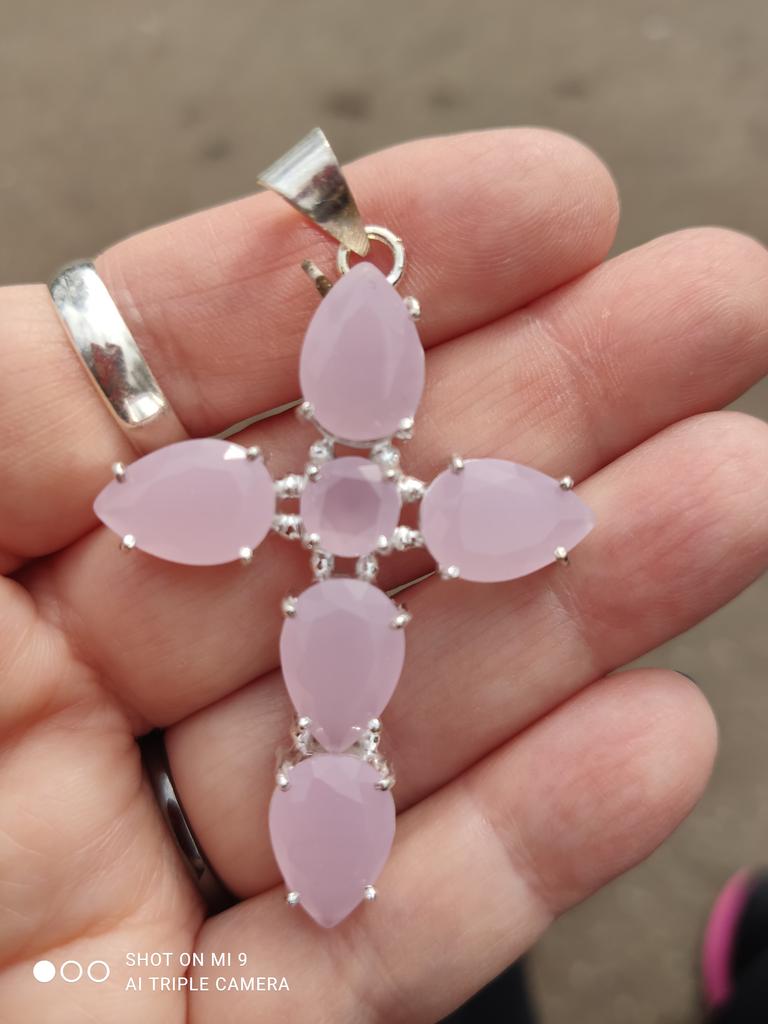 La croix est magnifique, elle est très grande, les pierres mates rose pâle en forme de goutte sont superbes.