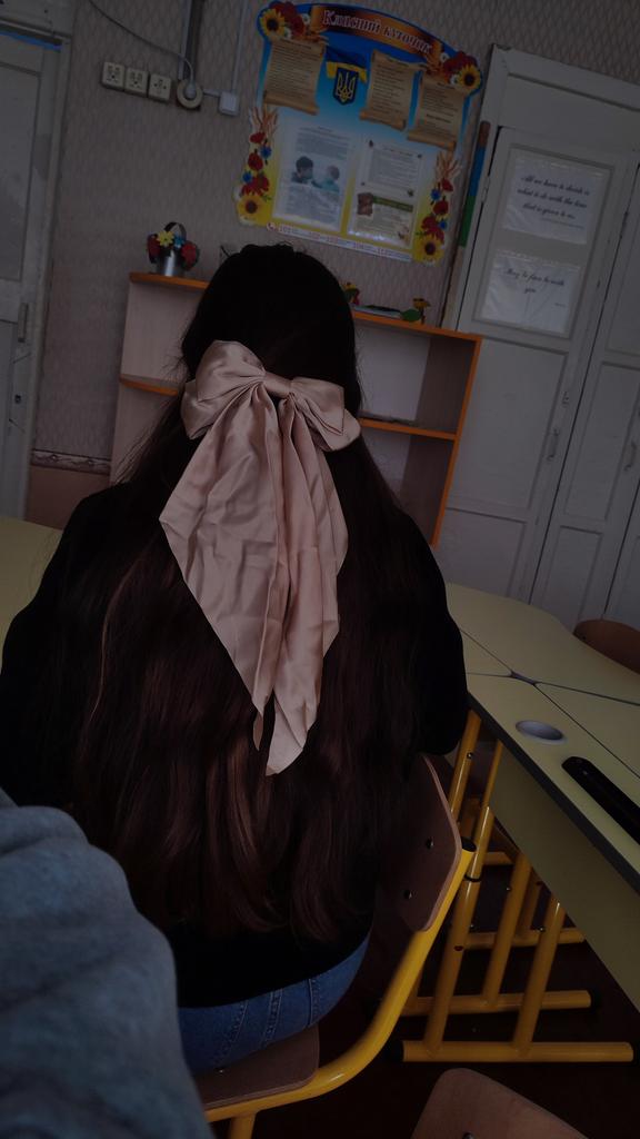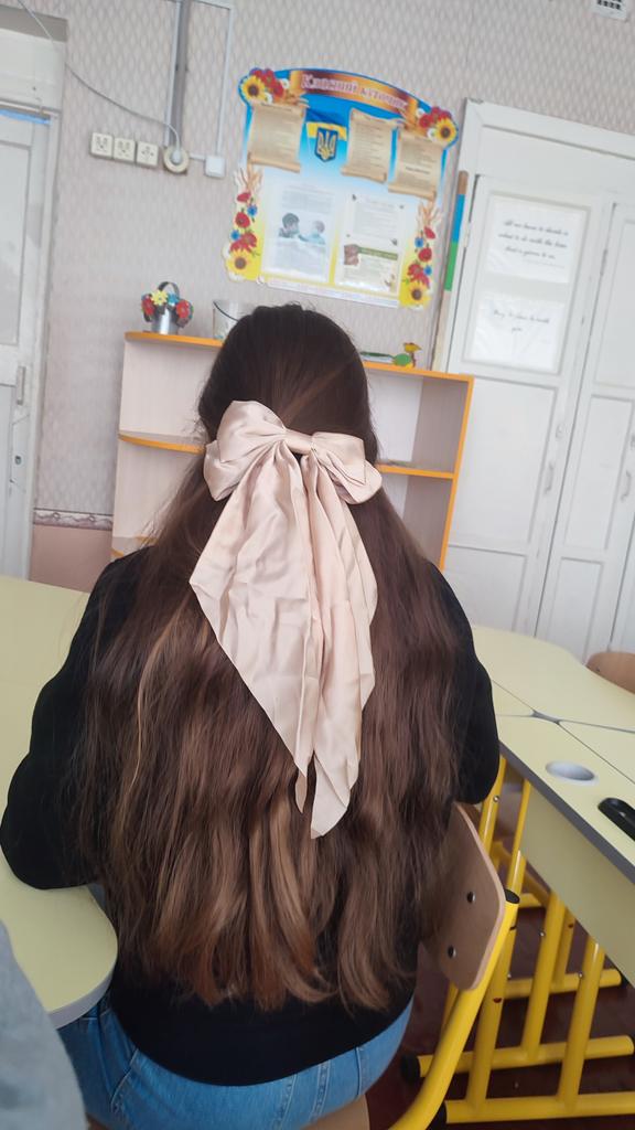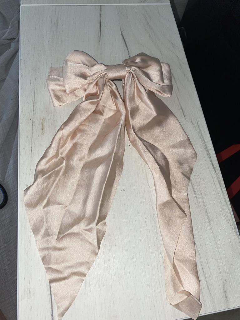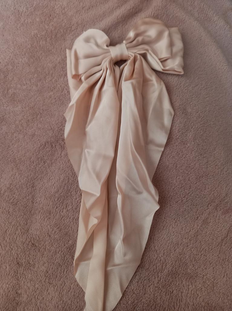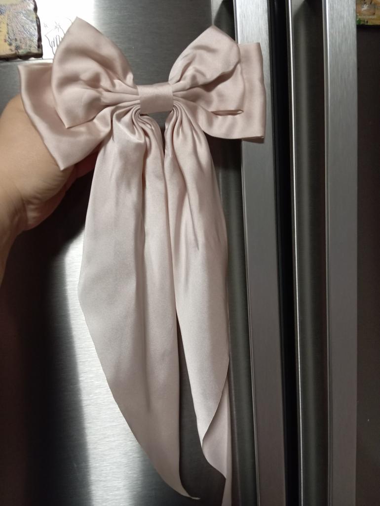Le noeud est beau, léger et avec des extrémités longues, comme je le voulais) Un peu froissé mais facile à défroisser. La barrette elle-même est intacte, s'attache facilement et tient bien sur les cheveux