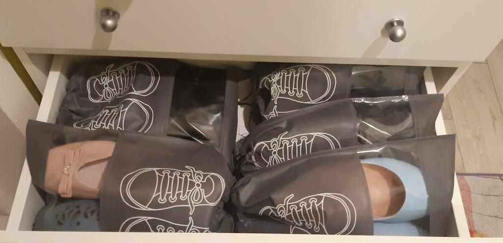Bons petits sacs. Ils ont permis de ranger 6 paires de chaussures pour adulte dans un tiroir étroit de commode. La taille M a facilement contenu des baskets basses de taille 39, la taille L - des bottines basses de taille 39.